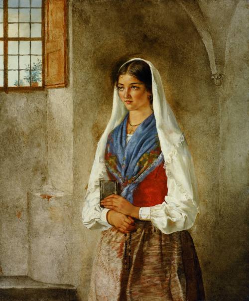 As Musacchio says, "She understood her artwork as a duty aligned with her religious faith" (9). The Alexanders, although living in a famously Roman Catholic society, were Protestant, devout Evangelical Christians. This proved no barrier to Francesca's desire for charitable action, although it irked the local clergy from time to time, and she became a widely admired and loved figure of charity amongst the local peasantry or contadini. In contrast with most of their expat peers, the Alexander women mixed with the local working class: as Giuliana Artom Treves, author of The Golden Ring: The Anglo Florentines, 1847-1862, the classic account of these people, has pointed out, the family were not just amongst the first foreigners, but even among the first Italians, to make forays into the villages of the Pistoia Apennine plateau. They made friends among the local people, who then became the usual subjects of Francesca's artwork, in her favoured medium of pen and ink. Often portraits - and in this she was following her father's specialism - these drawings might also use recognisable local individuals as models for religious compositions such as Saint Agnes (1861) and Vision of the Madonna and Child (late 1850s). For the raising of charitable funds, Francesca would also make the portraits of her peers amongst both native Florentines and visiting Britons and Americans (such as Paolina Nardi [1860s] and Emily Russell [1862]).