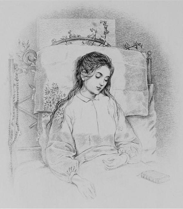 That Francesca's work was due to her father's early encouragement and her self-imposed programme of learning from copying is apparent in the limitations of her ability to render the human figure and her small range of compositional devices. At the same time, the effectiveness of her apprenticeship can be seen in the advances from the naivety of a Nativity drawn in the late 1850s to the assured arrangement and portraiture of her group portrait Christmas of the early '60s. It was at this time that she produced a handful of paintings (Decorating a Shrine, 1865, appears on the cover of the book, shown above) whose attractiveness make one regret that she did not seek any more rigorous training. In Charity (1861), she approaches the appeal of the equally religious Pre-Raphaelite work of Charles Collins, such as The Devout Childhood of St Elizabeth of Hungary (1852) and The Thoughts with which a Christian Child should be Taught (1852).