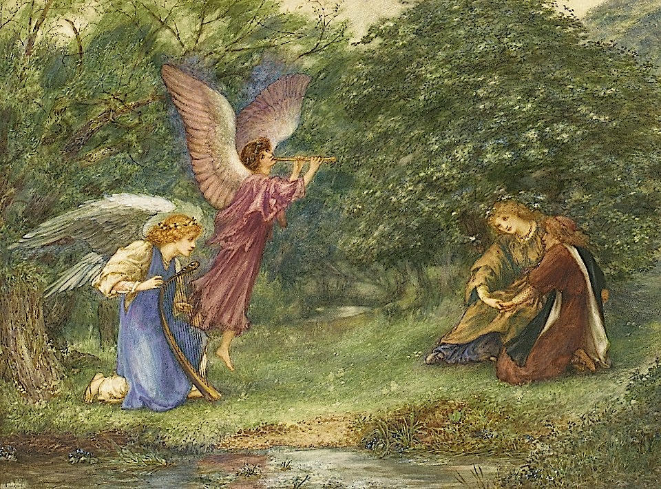Rooke would have been familiar with the work of Rossetti through Edward Burne-Jones, for whom Rooke worked for many years as his principal studio assistant. Rooke's watercolour shows a pair of lovers seated on the grass, hands entwined, in a forest clearing near a stream "where wan water trembles in the grove." The "one flame-winged brought a white-winged harp-player" described in the poem are to the left of the composition. In Rossetti's own art a winged figure of Love figures prominently in a number of compositions, such as Dante's Dream at the Time of the Death of Beatrice, Love's Greeting, and Dantis Amor. Rooke, unlike Rossetti, was not both a poet and a painter. As the well-known collector Merton Russell-Cotes wrote of Rooke in his autobiography: "Rooke produced his poetry not in verse, but portrayed it in his pictures." (738).