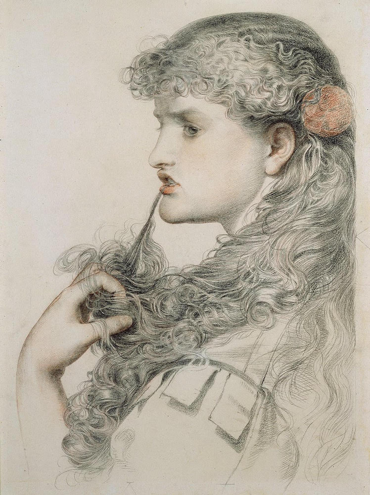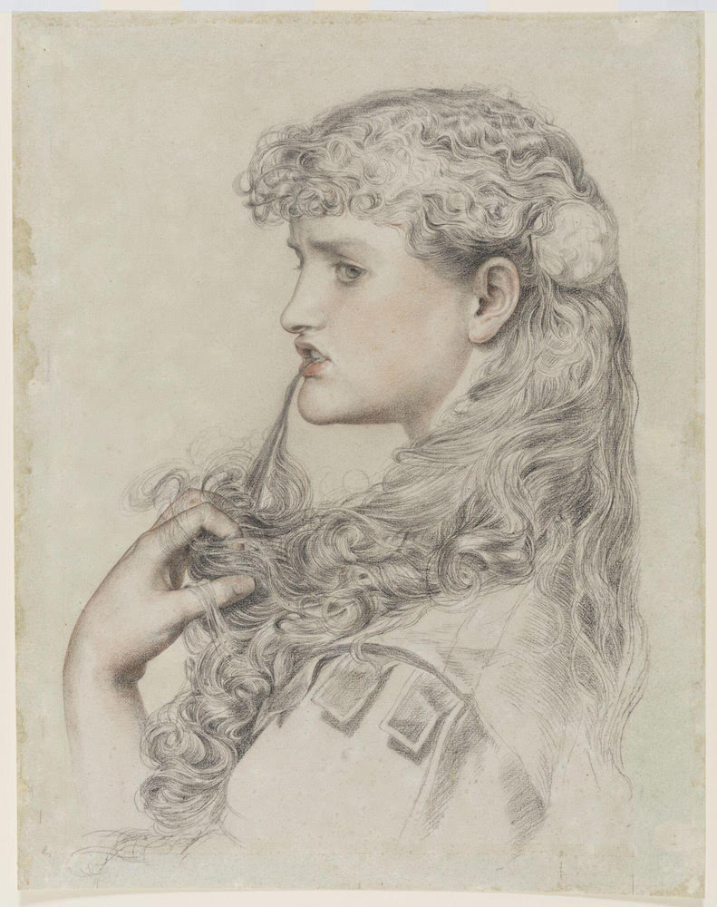 Proud Maisie is the most famous of Sandys's drawings, its popularity attested to by the fact that it exists in at least thirteen known versions of varying quality. The first of these drawings was exhibited at the Royal Academy in in 1868, no. 735, under the title Study of a head. This is likely the version illustrated here from the collection of the Victoria and Albert Museum. A later drawing exists from 1868 that is now inscribed Proud Maisie, also in the collection of the Victoria and Albert Museum (accession no. E.1253-1948). This suggests that at some point early on Sandys decided this drawing would be more commercial with a title suggesting a literary allusion, in this case derived from a well-known poem by Sir Walter Scott, "The Pride of Youth," which appears at the end of Chapter 40 in his The Heart of Midlothian: