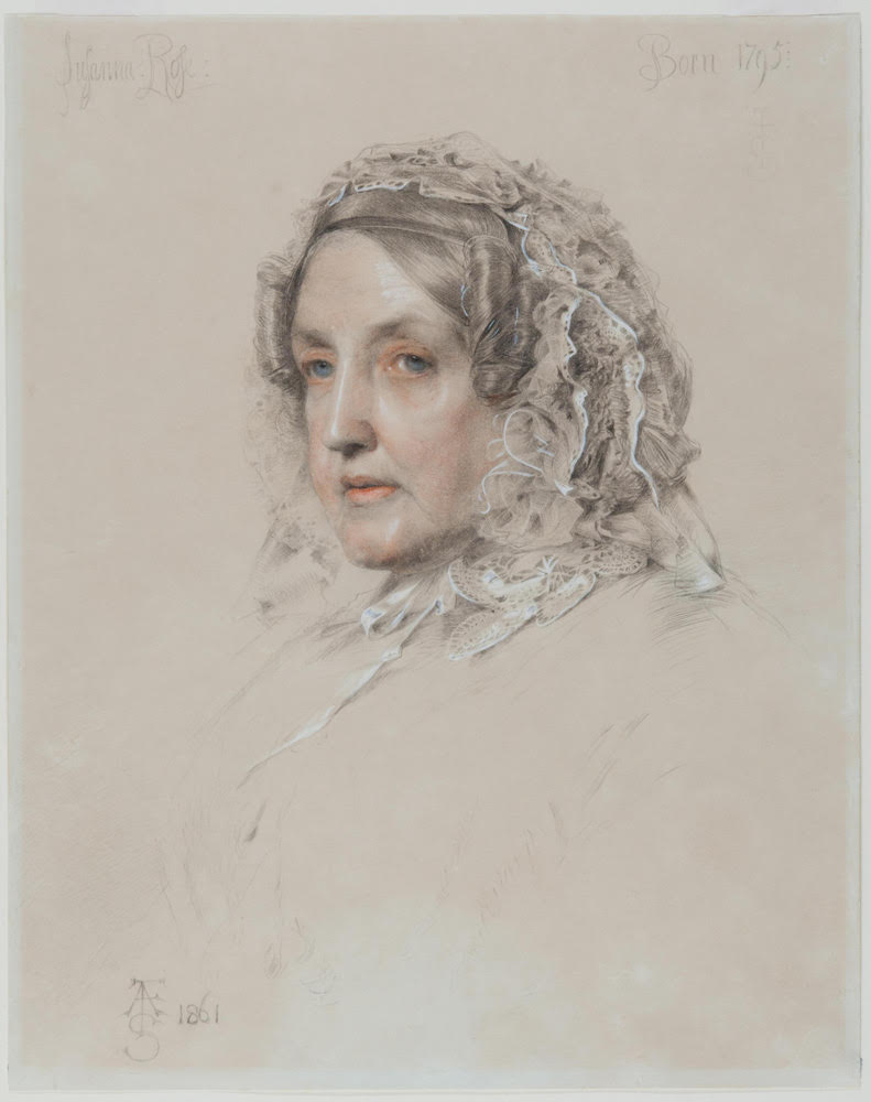 Half-length of an elderly woman facing half to the left, the eyes turned slightly towards the spectator. The head is almost completely covered by a lace and muslin cap trimmed with bright blue silk ribbon. Her white hair shows in front of the cap and is dressed with a ringlet on either side of the face. There is a narrow band of black velvet ribbon across her forehead (as in the ferronnière fashion of c. 1835), and a wider bow of it, which probably attaches to the cap, is beneath her chin. The tails of this bow partly hide a small brooch set with stones. Two interlocked rings seem to depend from one of the long tails. She wears a black velvet (?) dress with a lace collar, and a brown fur wrap surrounds her shoulders. Behind her head, as if on a screen, hangs a brocade panel of late medieval design, a device taken from late 15th and early 16th century devotional paintings, which Sandys had already used in some earlier portraits…. To the right of the sitter's head is a view through an open double window, showing a summer landscape with a lawn and a villa half hidden by shrubs and trees, with distant trees, hills, and sky beyond. Again this is the device from late 15th and early 16th century devotional and portrait paintings. [164]