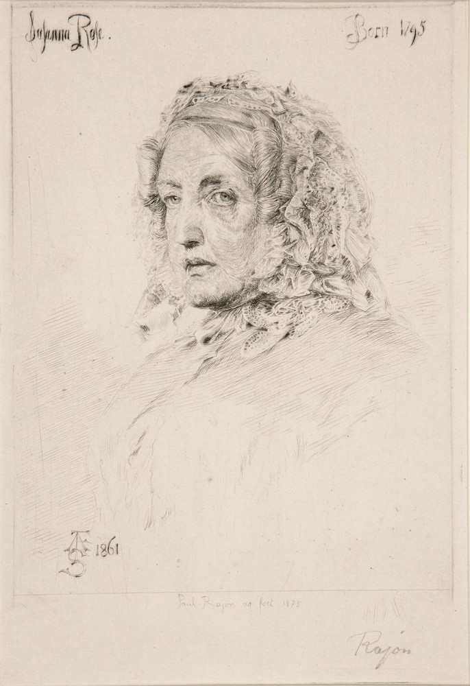 An etching of the portrait of Mrs. Rose by Paul Adolphe Rajon was executed in 1875. Another etching of this subject by Charles George Lewis was used as the frontispiece for A Collection of Engraved Portraits Catalogued and Exhibited by James Anderson Rose at The Opening of the New Library and Museum of the Corporation of London, November 1872 and published by Marcus Ward in 1874. An impression of this etching is in the collection of the British Museum, museum no. 1873,0712.1239.