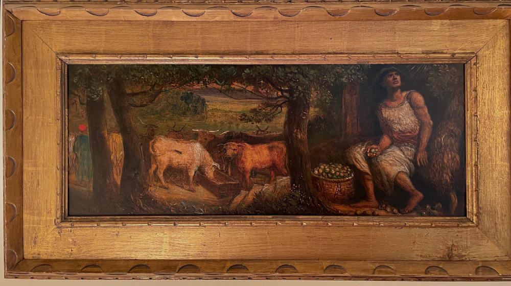 other scriptural subjects portrayed different moments of crisis or anguish for their protagonists, for example… The Call of the Prophet Amos of 1875. While the figure in the latter work occupies only one corner of the horizontal composition, he looms large – even excessively so - in scale, and his spatial relationships to the animals and landscape nearby is problematic. Yet his emotional/psychological state also sets him apart, and his size, the grove of trees, and the basket all seem to crowd him into a rather suffocating position. By 1875 this had become a recurrent devise that Smetham used to create psychological isolation and to suggest the claustrophobia of individual situations, and in this late work the effect still remains powerful. Smetham also asserted that the subject suggested the ‘glorious impartiality’ of God, writing in 1870: ‘How grand is this that the ploughman on his sod, Amos the gatherer of sycamore fruit and herdsman, and Daniel invested with sweeping cares and dignities of state are one before the Glorious Father!’” [106, 108].