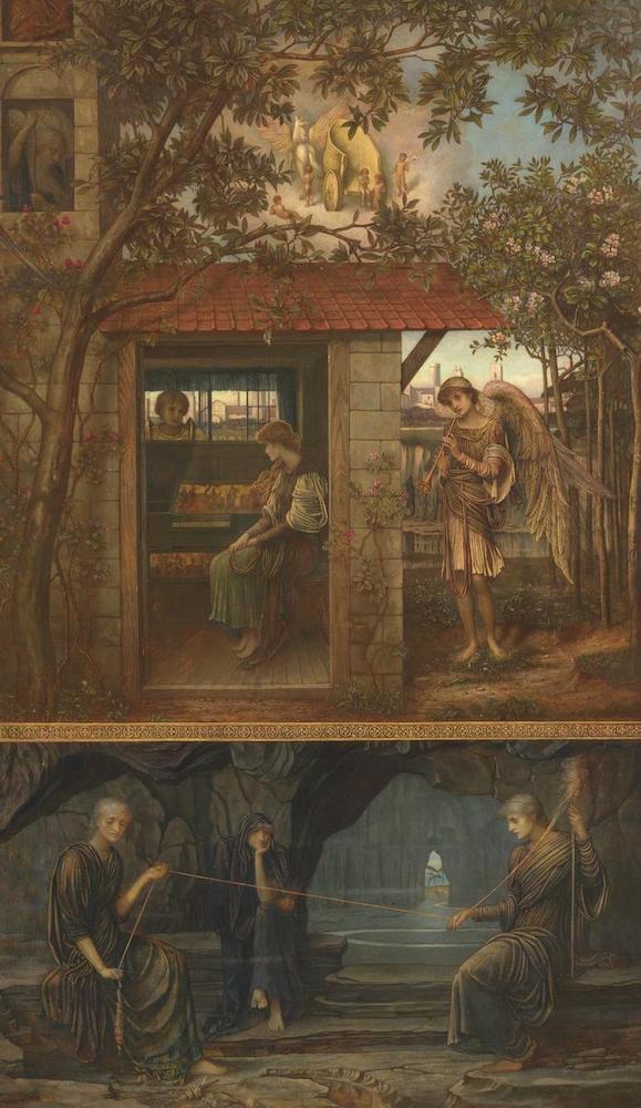 The influence of Edward Burne-Jones is even more clearly seen here than in many of Strudwick's other paintings. The Fates was one of a number of classical paintings Burne-Jones started in the 1860s. He began it in 1865, made several studies for it, and then abandoned the project temporarily. He returned to it in the early 1870s, when he made numerous pencil sketches for this subject. The painting was never carried further, however. The car of Love in the upper centre of Strudwick's picture also reveals the impact of Burne-Jones's work: his painting The Car of Love (Love's Wayfaring), now in the Victoria and Albert Museum, dates from c.1891-98 but earlier projects like The Triumph of Love (The Passing of Venus), first designed as a project for tiles for M.M.F. & Co., dates as far back as 1861.