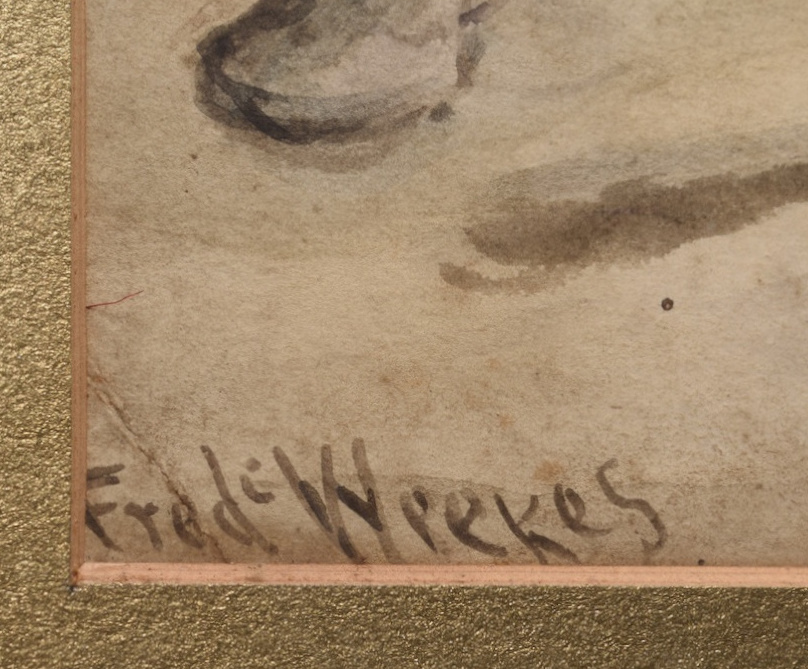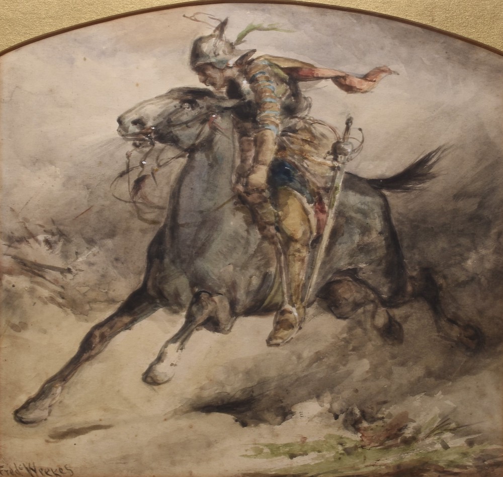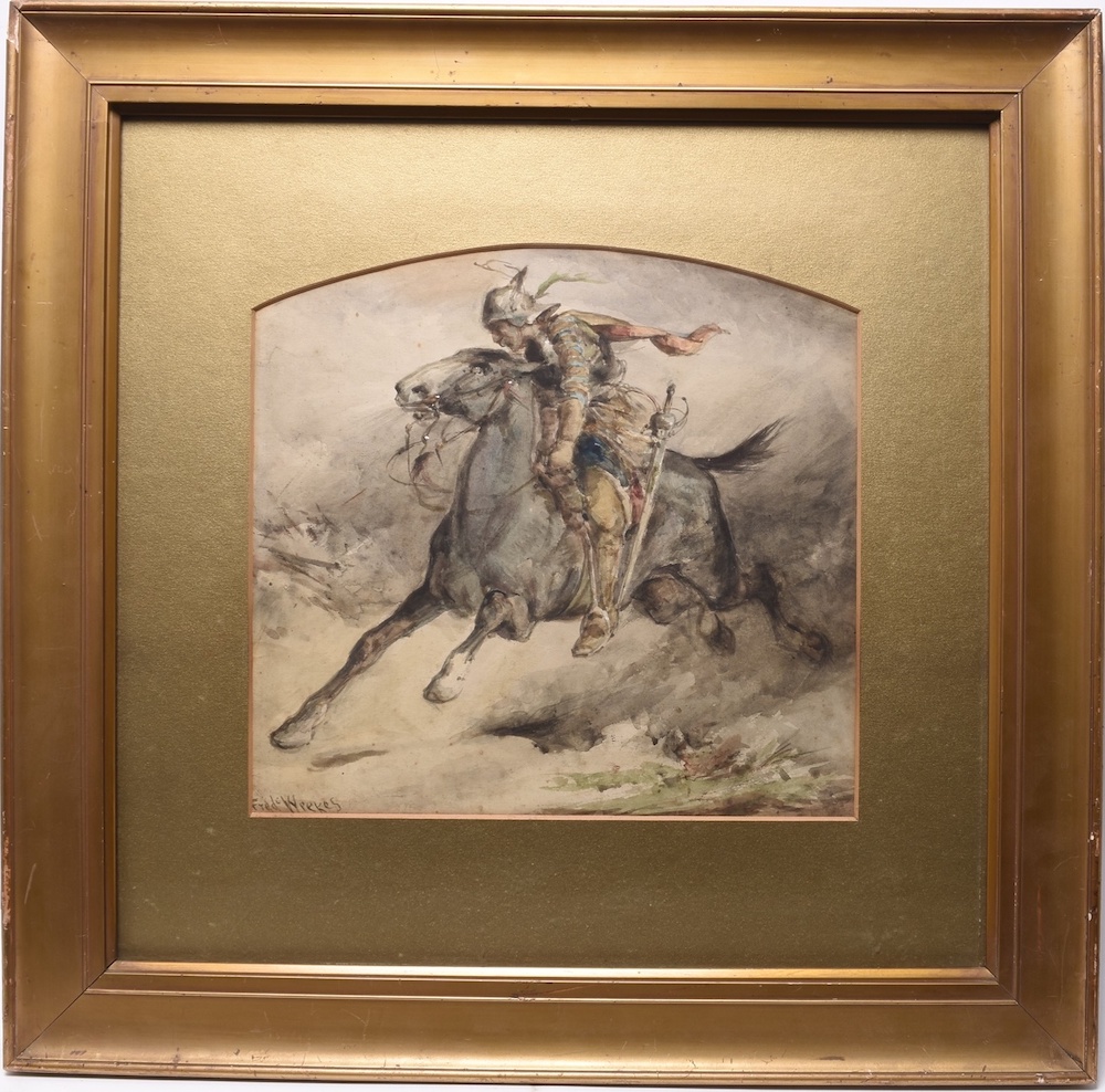 Knight in Armour on a Charging Destrier by Fred Weekes (1834-1924). Date not known. Watercolour. 28.5 x 30.5 cm; frame 53 x 54 cm with Weekes's signature on the lower left. The label on the back bears the name of James Howell of Cardiff. This probably associates with the period when Weekes was working either at Cardiff Castle or at Insole Court, Llandaff, from the 1870s onwards, but since work at both continued for so long, dating this watercolour remains problematic. Photo reproduced with kind permission: © Halls.