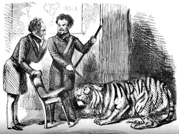 The unruly tiger represents India (a map of which appears on the hall) only recently pacified after the Sepoy Muntiny of 1857; Pam is the Prime Minister, Lord Palmerston; and Sir Colin is Sir Colin Campbell, the British general appointed to quell the Indian uprising. For another Punch cartoon featuring these two, see Every Inch A Soldier.