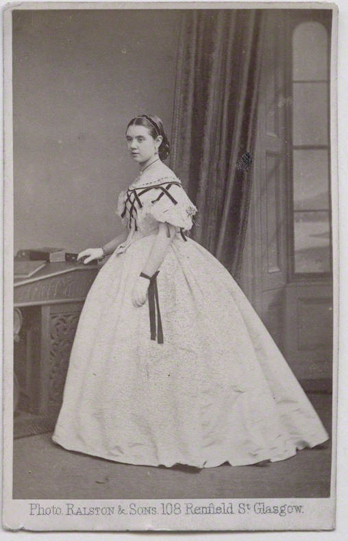 A typical carte-de-visite produced by Ralston’s, Glasgow, dated around 1865. The background is typically artificial and set-like, but the photographer captures the sheen of the subject’s extravagant crinoline dress. — Simon Cooke