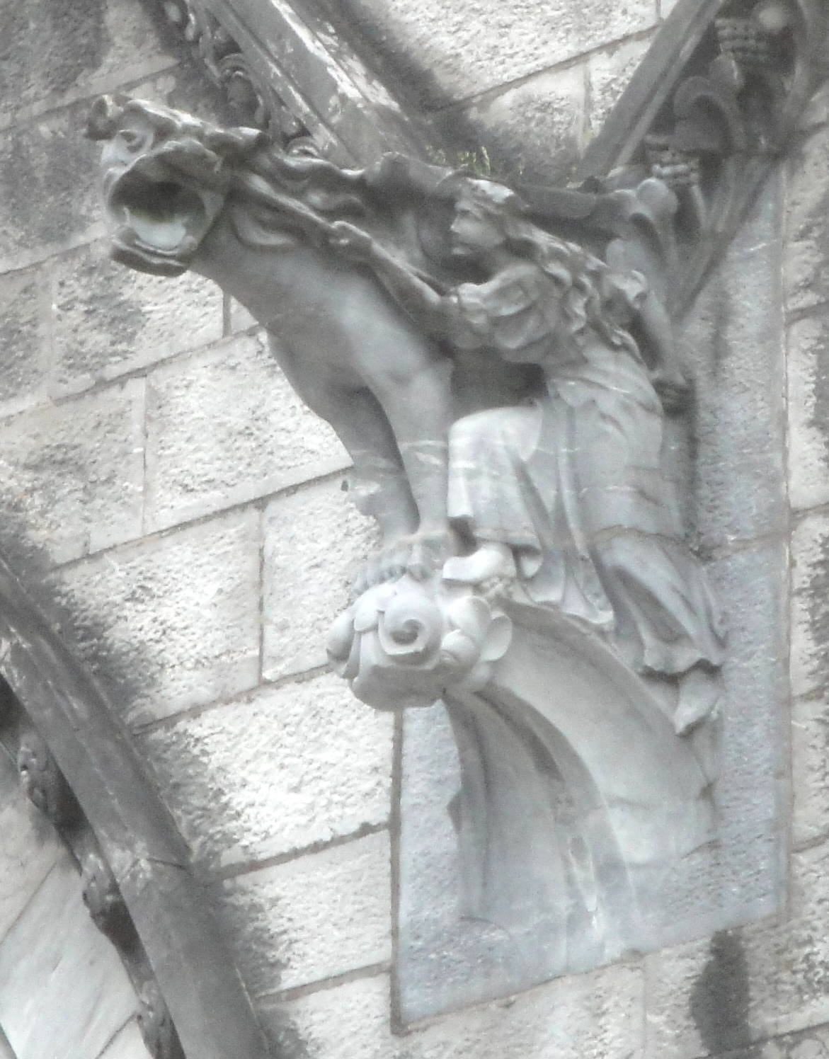 On the left, the grotesque creature on parade is a winged griffin, with a bird-like head, an animal's ears and large, stylized wings. To its right, as seen in the picture on the right, is a projecting, functional spout, a gargoyle in the shape of a dog's head.