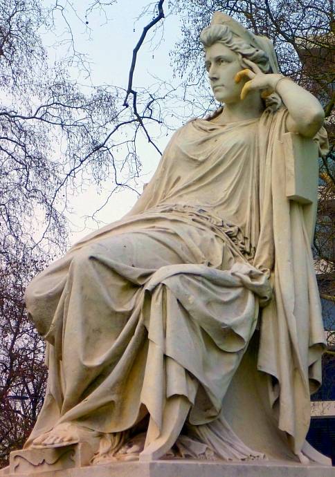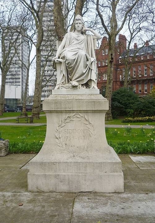 Chavalliaud's best-known work, this statue of Sarah Siddons shows her as the tragic muse (hence the mask), after the famous painting of her” by Sir Joshua Reynolds. A placard on the Green tells us that it was unveiled, suitably enough,” by Sir Henry Irving. [continued below]