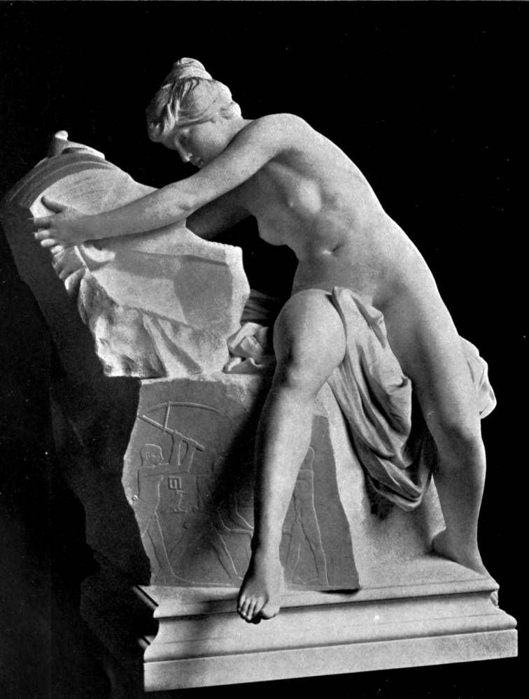 Whereas the most common nineteenth-century portrayal of the sphinx with a person juxtaposes the sphinx, who often symbolizes the female-as-danger, with a young man — think of famous paintings by Ingres and Moreau — here Blanchard has a young woman confronting the mysterious creature.