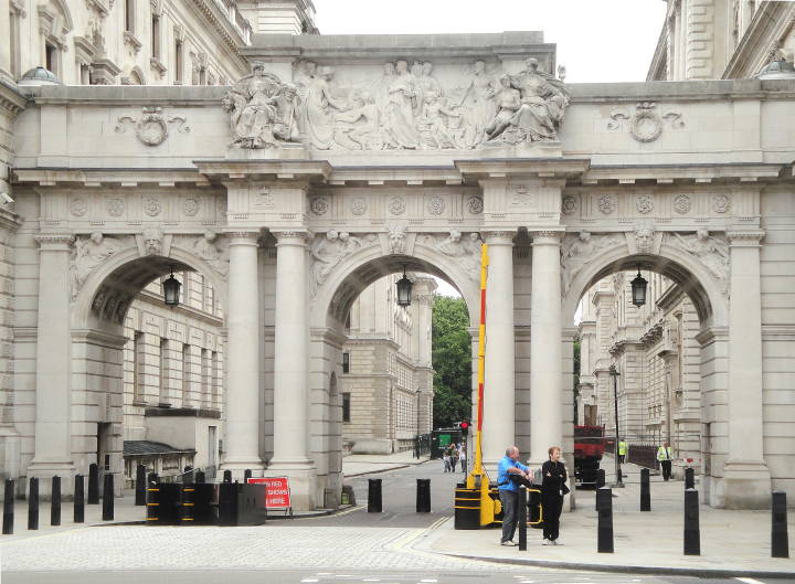 Arch over King Charles Street (side facing Parliament Street). J. M. Brydon, architect (completed” by Henry Tanner), and William Silver Frith (1850-1924) and Paul Raphael Montford (1850-1924), sculptors. 1908. Stone. Montford did the sculptures on the upper part of the outside of the arch, Frith these on the lower and those on the inside. [Click on images for larger pictures.]