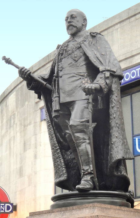 Edward VII by Louis Frederick Roselieb [later Roslyn] 1878-1934. 1911. Tooting Broadway directly in front of the Tube station. London SW17. Photograph of the monument in its urban setting. [Click on these pictures and those below to enlarge them.]