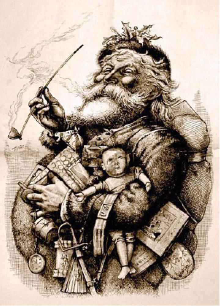 Two by the great American political cartoonist and book illustrator, Thomas Nast: Left: Merry Old Santa Claus. Harper's Weekly (1 January 1881): 8-9. Right: I wish you all a Merry Christmas. 1871. From pr1vate collection. [Click on images to enlarge them.]