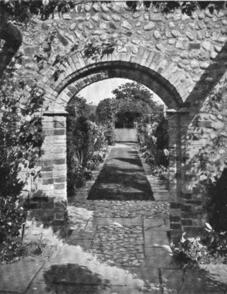 Left: Runton Old Hall, Suffolk, seen from the North West. Middle: Garden Archways designed by Baillie Scott. Right: Garden designed by Miss Jekyll.