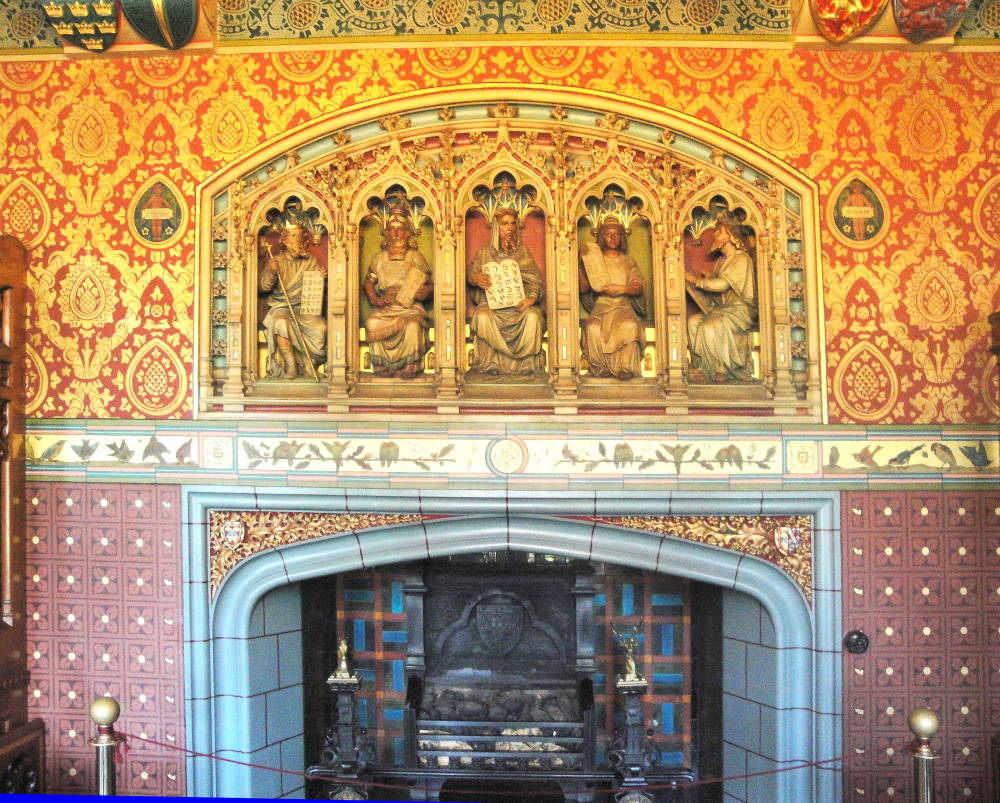 Fireplace by Thomas Nicholls. Left to right: (a) Moses sits surrounded by figures representing ancient languages: Greek, Assyrian, Hebrew, Egyptian, and Celtic — with Bute himself portrayed as studying Celtic runes at the far right (The Strange Genius, 43). Both the large painted tile mural of Ezekiel in the roof garden and the fact that Moses holds the tablets conventionally signifying the ten commandments might suggest that Moses represents the law and his companions other law givers — Solon, Hammurabi, and so on. In fact, the tablets just contain the Hebrew alphabet and not the ten commandments (b) The Egyptian Pharaoh holding a tablet with hieroglyphics. (c) Moses rather incongruously depicted as a blond Nordic type. The Assyrian figure, although wearing middle-eastern garments, also has blond hair — the effect of using gold gilt. Entire fireplace.