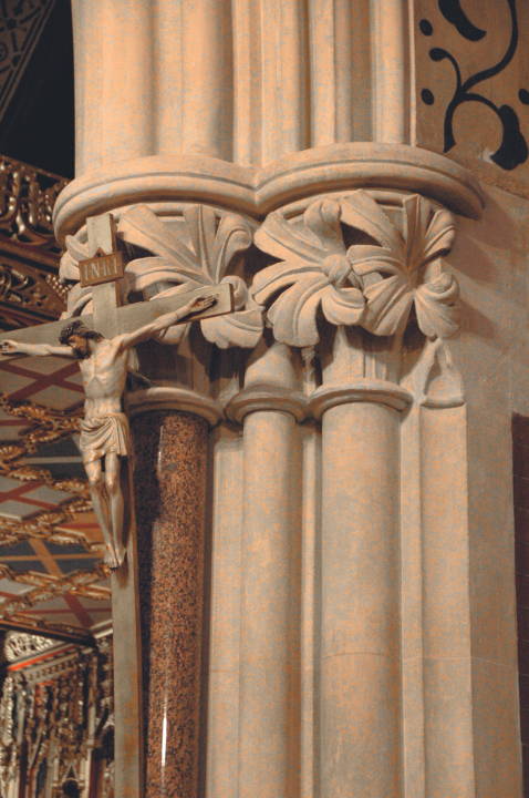 Thompson, trying to defend the church against those, like Summerson and Hersey, “who find All Saints' systematic only in its ugliness,” sometimes comes up with rather mixed praise. “The pulpit, for example, although lumpish in form, is a triumphant display of the colour pageantry of rocks and marbles: Derbyshire fossil grey, autumn red Languedoc, warm Sienna, and cool Irish green, set on fat brawny pink granite columns which branch into waving seaweedy capitals. Even if one does not find this great piece of coloured sculpture beautiful, surely one can sense the happy enjoyment which produced it? ” (238).