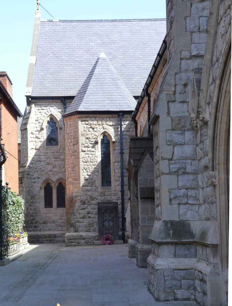 Left: The keft side of the church. Right two: St. Peter's Parsonage. Note the mosaic above the door.