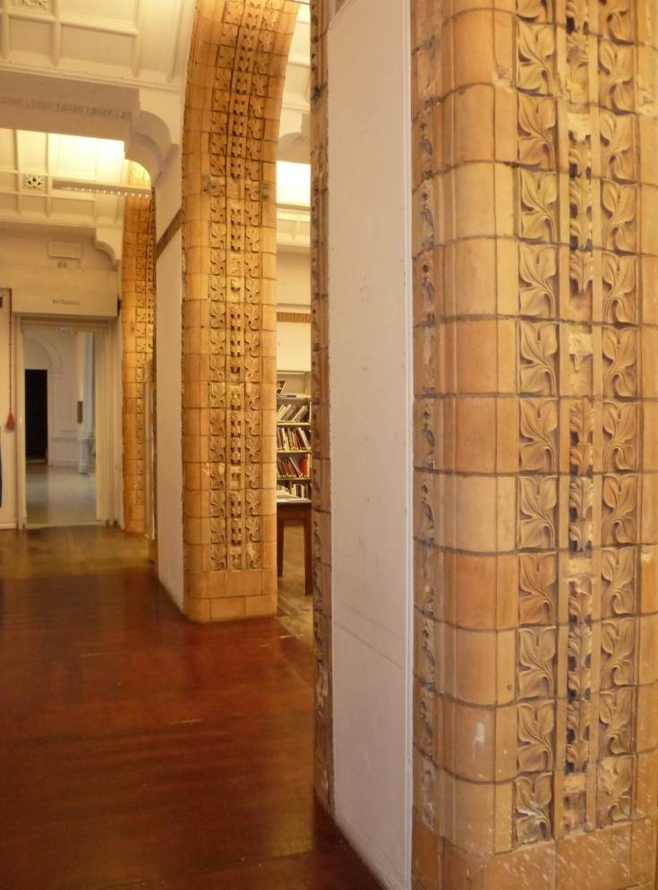 Left: Close-up of Creswick's portrait medallion of Homer. Right: Terracotta-tile clad arches on the first floor, in the former Lending Library. A contemporary report in the British Architect commented, "the eye roamed over a profusion of graceful arcades and stately pillars, whose effect is very striking, reminding one more of a Venetian palace than a Leeds corporate building" (qtd. in "Municipal Buildings and Art Gallery"). This room is now used as an art library: the door at the end leads to the adjoining art gallery, designed by W.H. Thorp (1852-1944), which was opened in 1888.