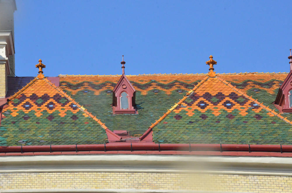 Left: The church’s beautifully tiled roof, which recalls that on Budapest’s St. Matthias Church, is decorated with Zsolnay ceramics. Right: The church interior as seen from immediately inside the entrance.