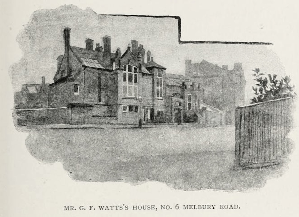 The Prinseps' lease ran out in 1871, and a few years later the original Little Holland House was demolished to make way for Melbury Road — which, in turn, became a favourite place for artists to build their studio houses. Watts did not hesitate to re-establish himself there: "The new Little Holland House, for he transferred the name, was the first house built in the Melbury Road" (Watts 293). It was designed for him by Frederick Cockerell, and he added a picture gallery designed by his friend and neighbour Frederic Leighton's architect, George Aitchison. This new London home was featured in the Building News of 7 October 1881, and later illustrated by William Luker, Jr, for William Loftie's book about the area.