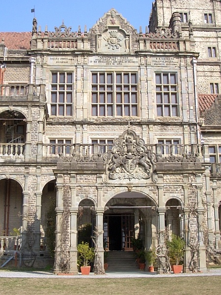 The Viceregal Lodge (now the Institute of Advanced Studies), Obervatory Hill, Shimla, India, by Henry Irwin. Completed 1888; tower height increased later by Lord Curzon. Local grey sandstone and light blue limestone, with iron girders, beams, and trusses.