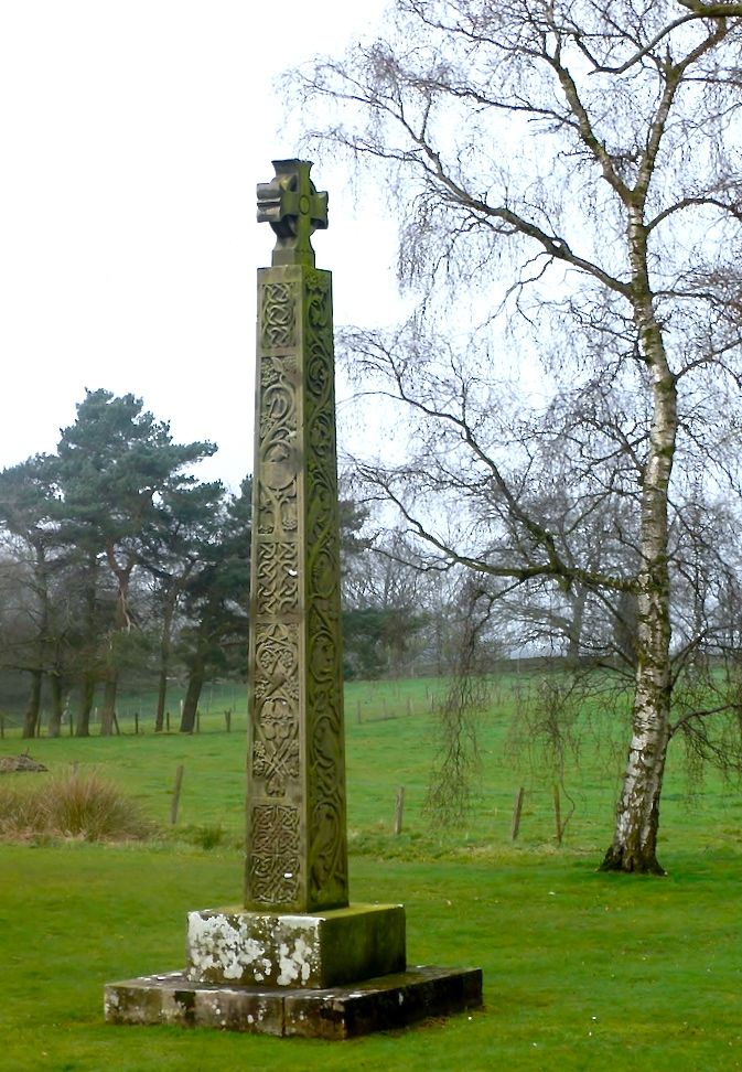 Version of the Bewcastle Cross in St Mary's Churchyard, Wreay. Architect: Sarah Losh (1785-1853). Stone-carvers: Losh herself, and William Hindson. Started not long after the church was finished (see Uglow 248), so probably in 1843, the design of this cross is based on the 14' high, late seventh-/early eighth-century Celtic cross in the churchyard at St Cuthbert's, Bewcastle. Grade II listed, it is made of sandstone and carved with figures, Celtic patterns, texts and an inscription in Latin to John and Isabella Losh, the parents of Sarah and her sister Katherine. It is located between the mausoleum that Losh also designed, and the Losh family graves enclosure, in the churchyard of St Mary's Church, Wreay, Cumbria.