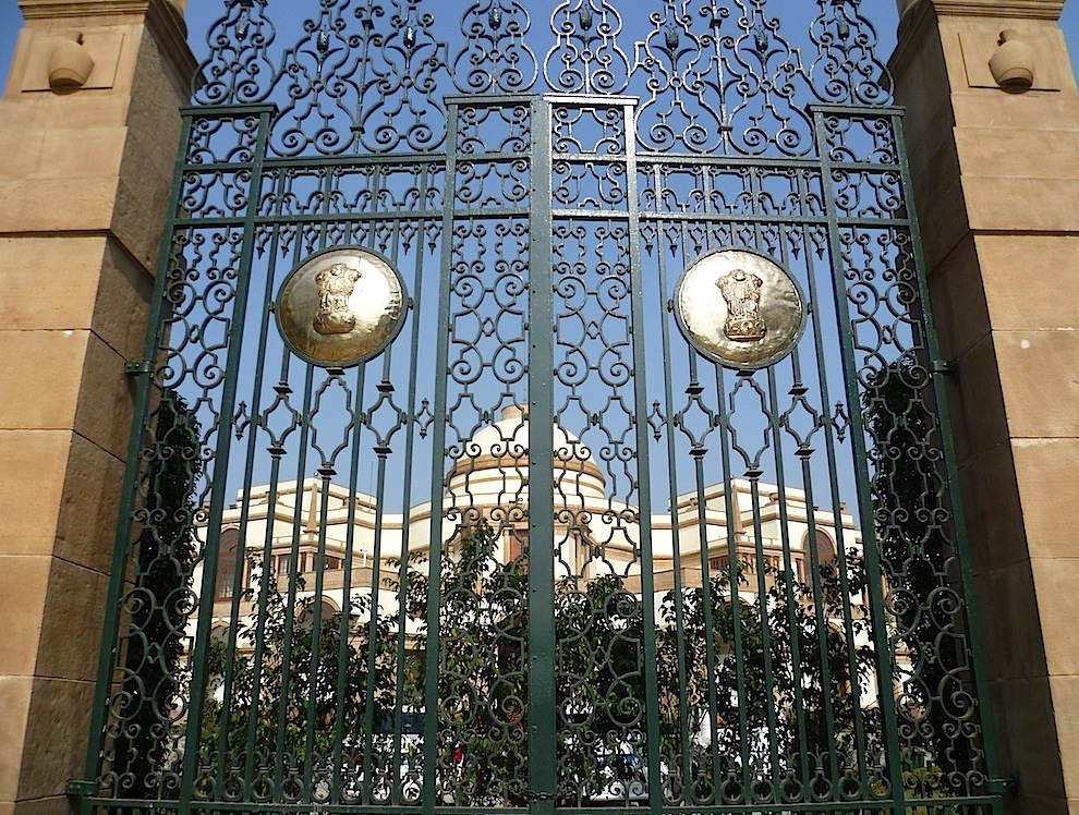 Left to right: (a) Entrance portico. (b) Close-up of the gates, featuring the State emblem in beaten bronze, depicting (amongst others) Asiatic lions and the Hindi for "Truth Alone Triumphs" from the Upanishads.(c) Three-quarter view towards the right.