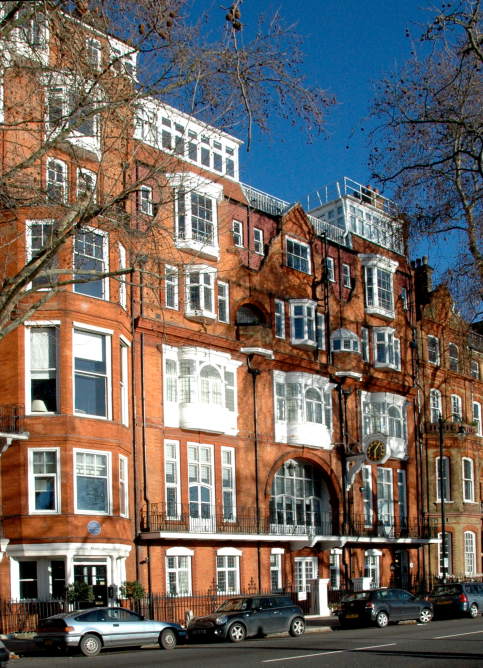 British Listed Buildings states: “1879. R Norman Shaw, architect. Five storeys, basement and dormers. Mostly 7 windows. Red brick. Cornice at third floor. Three wide oriel windows at second floor. Leaded lights. Iron balcony first floor. Octagonal clock on carved wood bracket at second floor. Altered upper storey.”