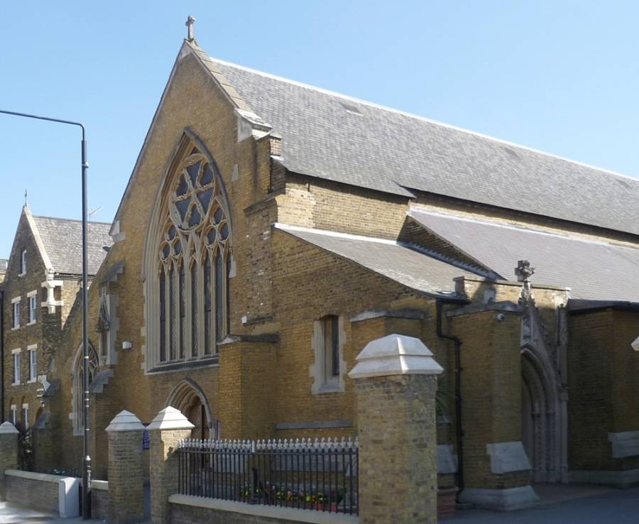 St Peter the Apostle's Church, Woolwich. Listed Building. Nave and aisles by A. W. N. Pugin (1812-1852), with builder George Myers (1803-1875), built in 1842-43. The Lady Chapel, smaller than in Pugin's original drawing, was added in 1850, and the chancel and side chapel, in keeping with Pugin's plans and manner, were added in 1887-89 by the Scottish architect Frederick Arthur Walters (1849-1931), who also did further work on Pugin's St George's Cathedral, Southwark. Myers used yellow stock brick with Bath stone dressings and slate roofs. The budget was limited: the dressings were limited too, except at the entrances, especially the south entrance. The church stands on Woolwich New Road, Woolwich, London SE18.