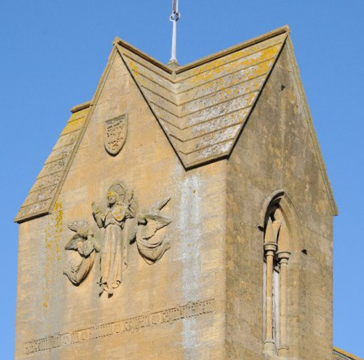 Yet the exterior, restrained as it is, is not at all without its own interest. Notable here is the lack of windows at ground level: the church interior is lit from above by clerestory lancets. This row of high windows, together with the tall slender buttresses, the steeply pitched roof, the gabled west tower, and the bell-cote with its little pitched cover, gives a strong impression of verticality, truly fitting for a Church dedicated to the Ascension. On the tower is a relief of Jesus, hands raised on blessing, at the ascension, with angels accompanying him on either side. The Architectural Review credits this to Farmer and Brindley.