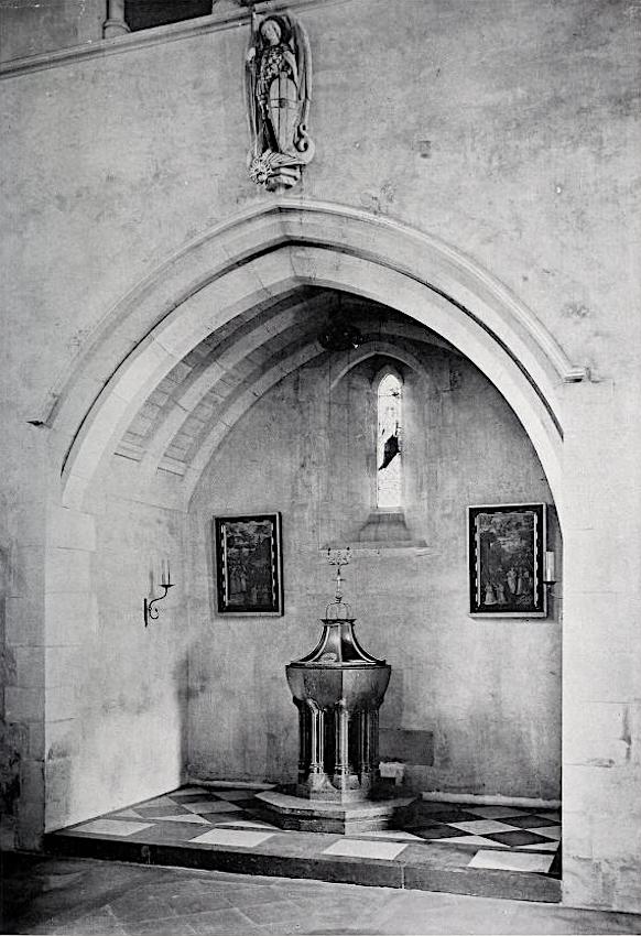 On the ground floor of the tower is a spacious baptistery. The figure of St Michael, having vanquished Satan in the form of a still-squirming dragon, presides over the arch, while inside is another of Tapper's elegant fonts, its dark grey marble brightened by a copper cover, with a silver relief of a dove, representing the Holy Spirit, descending above. Typically for this architect, this is all without any sense of extravagance or ostentation, but it is well thought out, of the highest quality, and aesthetically pleasing. Like the chancel, it is paved in black and white marble.