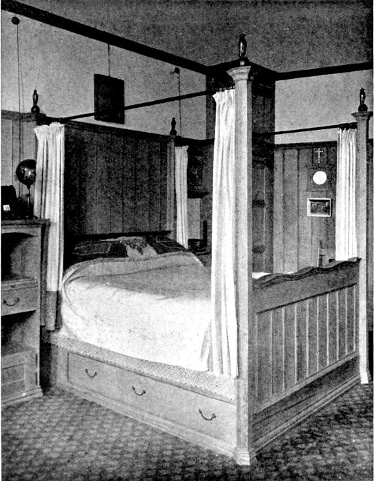 Mrs. Horniman's bedroom on the second floor is fitted and lined with oak. The bedstead, jewel-safe, writing-table, wardrobe, and all the usual bedroom equipment are fixed and fitted in to utilise every inch of space, and at the side of the bed the cabinets are fitted with sliding shelves, to bring the morning teatray over the bed. Mr. Horniman's dressing-room is fitted in the same manner with oak furniture.