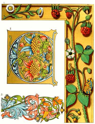 The border with the raspberries is from a Missal of the sixteenth century in the British Museum (Addl. 18,855), and was probably written and illuminated in the Low Countries. We have already mentioned the extraordinary freedom and ease of the Flemish work of that period. Every beautiful object was made use of for pictorial effect. Children, birds, jewels, shells, as well as fruit and flowers, are to be found. They particularly excelled in painting pearls. One border is green, with chains and ropes of pearls strewn all over it. The calendar represents domestic scenes, each strongly surrounded with a double gold line, the written part being simply left out in the middle, so that the scene forms its border. The gold ground presents a slightly different appearance from that shown in our engraving, as it is flat, being painted with shell-gold not put on very thickly. The shadows are of Burnt Umber, which has a very transparent effect on the gold ground.