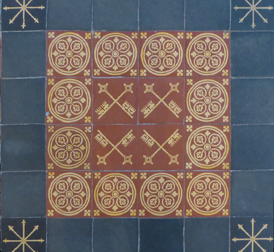 Red and yellow tiles with the Minster's cross-keys motif (1) by Minton, originally laid at the Chapter House, York Minster during Sydney Smirke's restoration of 1844-45. The Chapter House signage says, "many still have their original yellow overglaze" and explains that an invoice of 1845 indicates that "four patterns are unique to York Minster." This may be one of those four patterns.