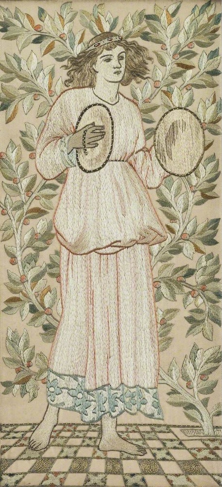 The elements that identify artistic embroidery are four, according to Hulse: design, colour, materials and stitch. To illustrate this, initial designs, trial pieces, paper patterns and finished work are illustrated throughout the text – and the high-quality illustrations, many of exquisite details, are a highlight of this volume. This will come as no surprise to readers who are also practitioners, in however modest a way, but Hulse’s address of these elements – and especially the last, stitch - will be not only interesting but illuminating for readers who have never picked up a needle and thread of any sort in their lives. Particular designs, such as Maids of Honour and Angel Minstrel/Angel with Cymbals, that were used over and over in diverse objects, illustrate the impact of the selection of colour, materials and stitch on a piece of work. Just on a prosaic level, who would have thought of all the specific items to which embroidery was applied under May Morris’s enterprising management? These are the ones assembled in this volume: book cover, cushion cover, fire screen, decorative panel, sofa back, table cover, runner, frieze, work-bag, sachet, photograph frame, clothing, banner. Put in charge of the embroidery section of her father’s firm in 1885 at the age of twenty-three, she certainly pulled her weight. Between 1888 and 1919, she also wrote extensively about her specialism, her various publications making an impressive list (13). She was also, of course, responsible for the prolongation of the Morris firm after her father’s death, and it could be surmised that she also played a crucial role in the eventual publication of her father’s writings, although they were published under J.W. Mackail’s name.