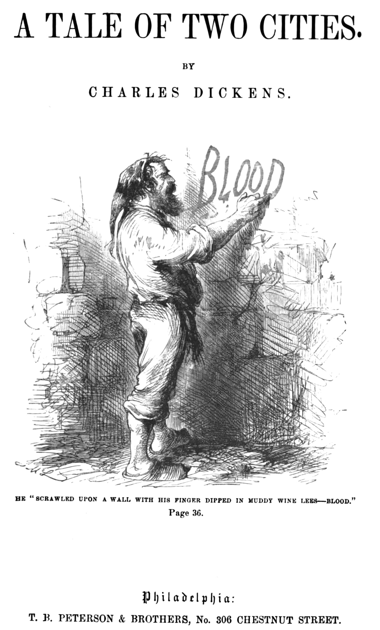 He "scrawled upon a wall with his finger dipped in muddy wine lees — blood." — fourth regular illustration for "Dickens's A Tale of Two Cities, Book I, Chapter 5, "The Wine-shop"; the text was first published in the All the Year Round number for 14 May 1859. This instalment, with the present illustration, first appeared in the 21 May 1859 issue of Harper's Weekly, p. 325. It was reproduced in the T. B. Peterson (Philadephia) volume as the title-page vignette. Wood-engraving: 8.3 cm high by 8.5 cm wide (3 ¼ by 3 ⅜ inches, vignetted, by John McLenan. [Click on illustration to enlarge it.] The illustrations appearing here are courtesy of the E. J. Pratt Fine Arts Library, University of Toronto, and the Irving K. Barber Learning Centre, University of British Columbia.