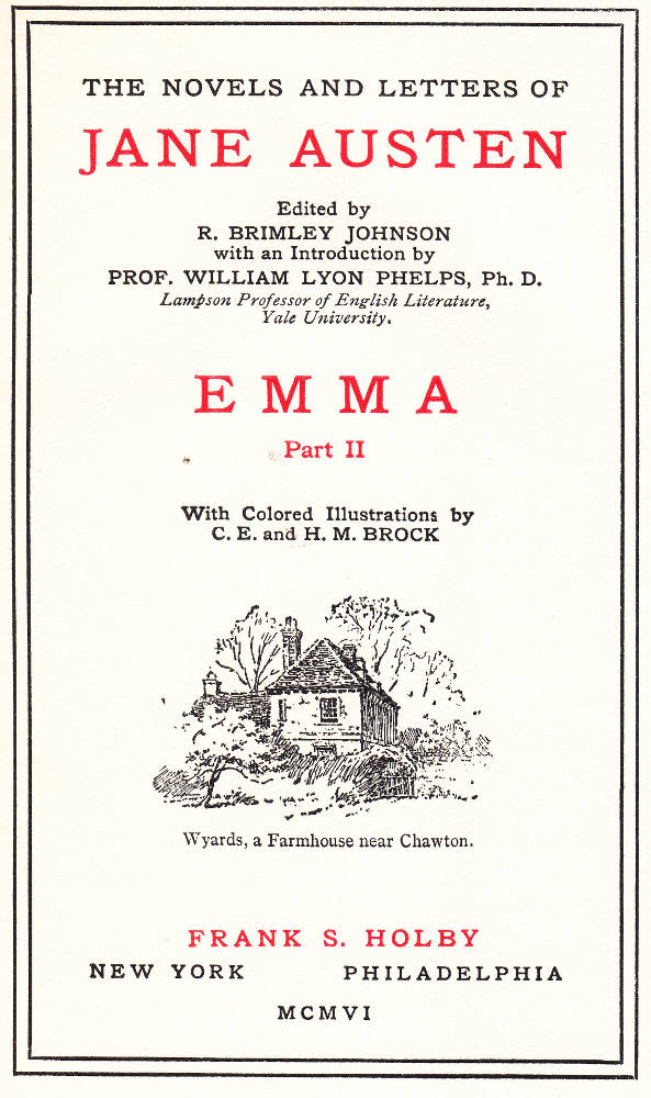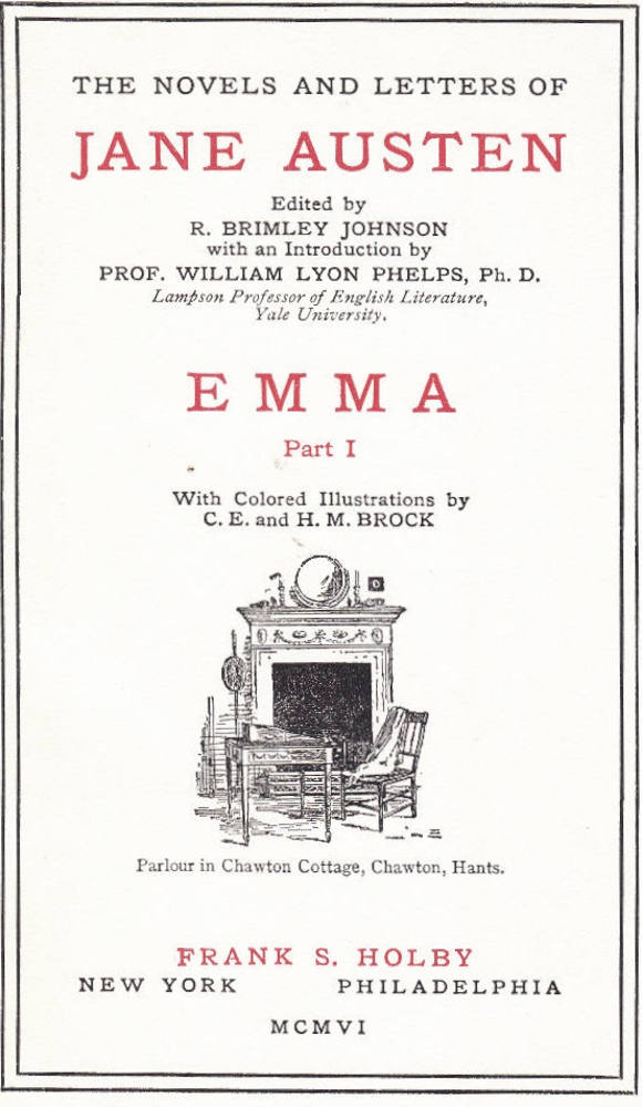 Austen, Jane. Emma. Ed. R. Brimley Johnson. With coloured illustrations by C. E. and H. M. Brock. The Novels and Letters of Jane Austen. New York & Philadelphia: Frank S. Holby, 1906. 2 vols.
