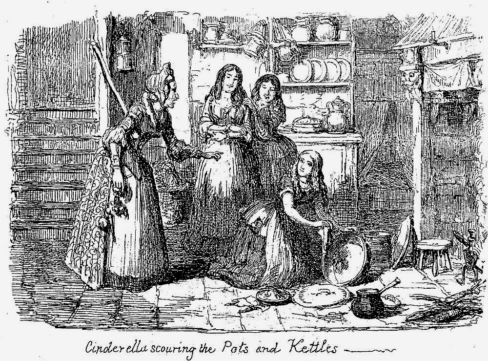 . . .but as the house and furniture had been settled upon her at her marriage, [the ste-mother] kept that on, and, by pinching and contriving in various ways, she managed, with a little property she had left of her own, to keep up appearances. And now began the cruel conduct towards poor Cinderella, whom she compelled to do all the rough, hard, dirty work of the kitchen and scullery, whilst she and her daughters did all the light and clean work required for the best rooms.