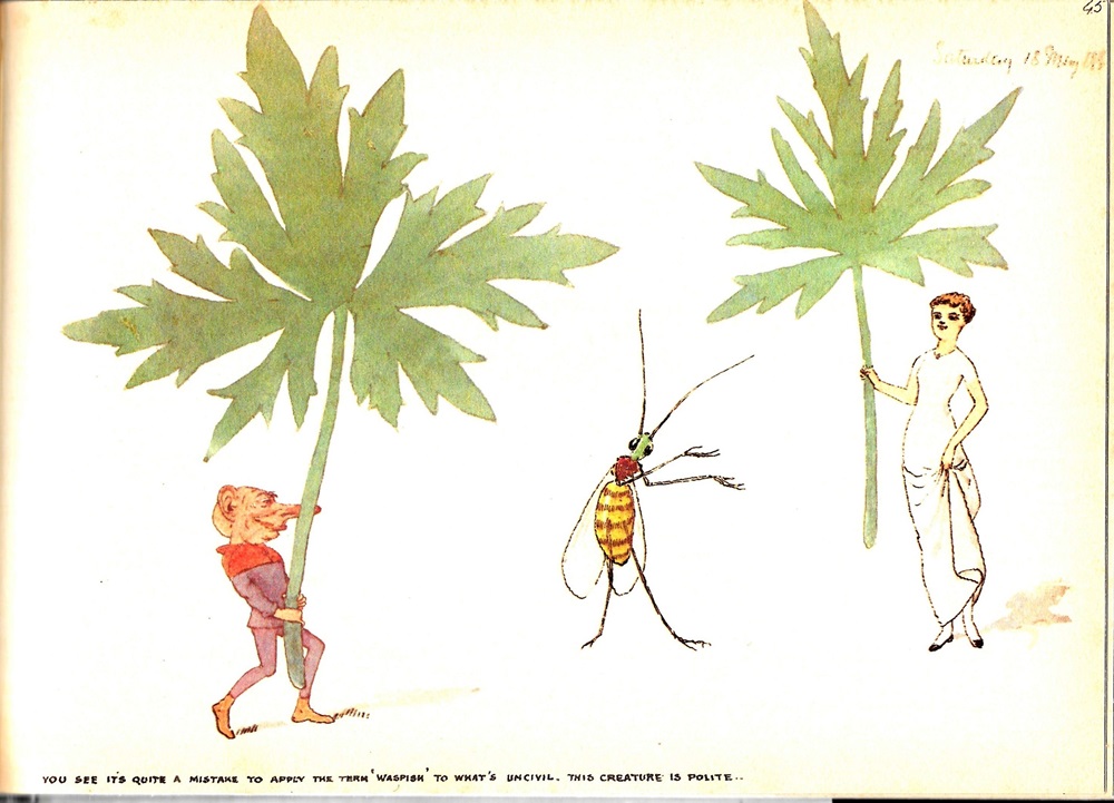 Fantastic scene, in watercolour and pen and ink, by Charles Doyle. Reproduced in Michael Baker’s The Doyle Diary, London: Paddington Press, 1978, plate 45. The inscription reads: ‘You see how it’s quite a mistake to apply the term “waspish” to what’s uncivil, this creature is polite,’ and shows a wasp apparently introducing a goblin to a wingless fairy. This is a page from Doyle’s sketchbook during his time in an asylum, and epitomizes his fascination with word-play combined with fairy imagery.