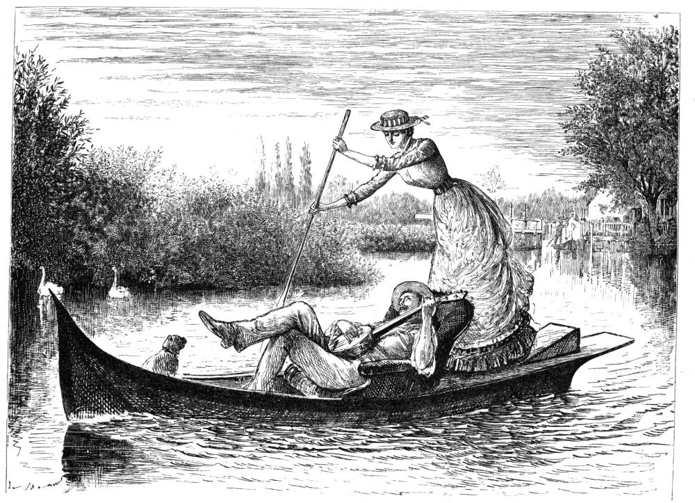 The Gondolette. From English Society. Sketched by George du Maurier. Unlike most cartoons in this series and the rest of this illustrator’s work, The Gondolette is set outdoors and depicts scenery. It is also one of several cartoons, like Banjonalities, featuring that instrument. Click on image to enlarge it.