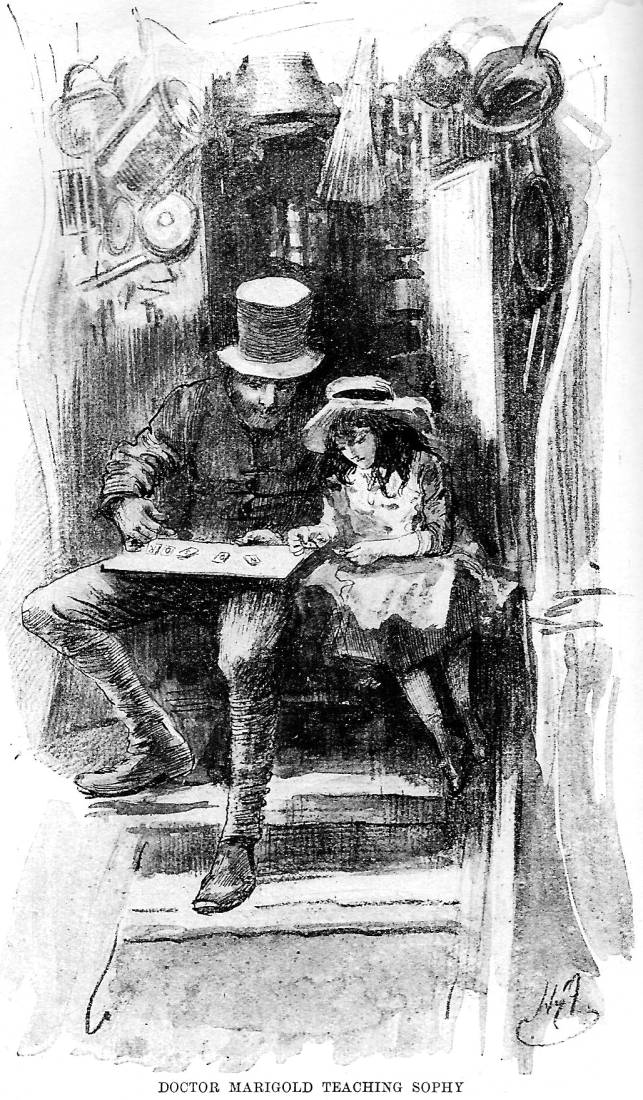 Left: E. G. Dalziel's "Doctor Marigold" (1868). Right: Harry Furniss's "Doctor Marigold teaching Sophy" (1910). [Click on images to enlarge them.]