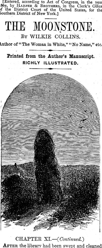 Collins, Wilkie. The Moonstone: A Romance. With sixty-six illustrations. Harper's Weekly: A Journal of Civilization. Vol. 12 (1868), 4 January through 8 August, pp. 5-529.