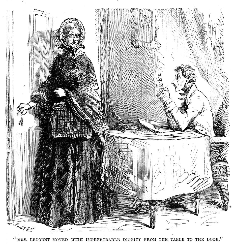 “We will not talk of it, sir, until your mind is more at ease,” said Mrs. Lecount. [“The Fifth Scene, Baliol Cottage, Dumfries.” Chapter II: p. 714; p. 212 in volume]