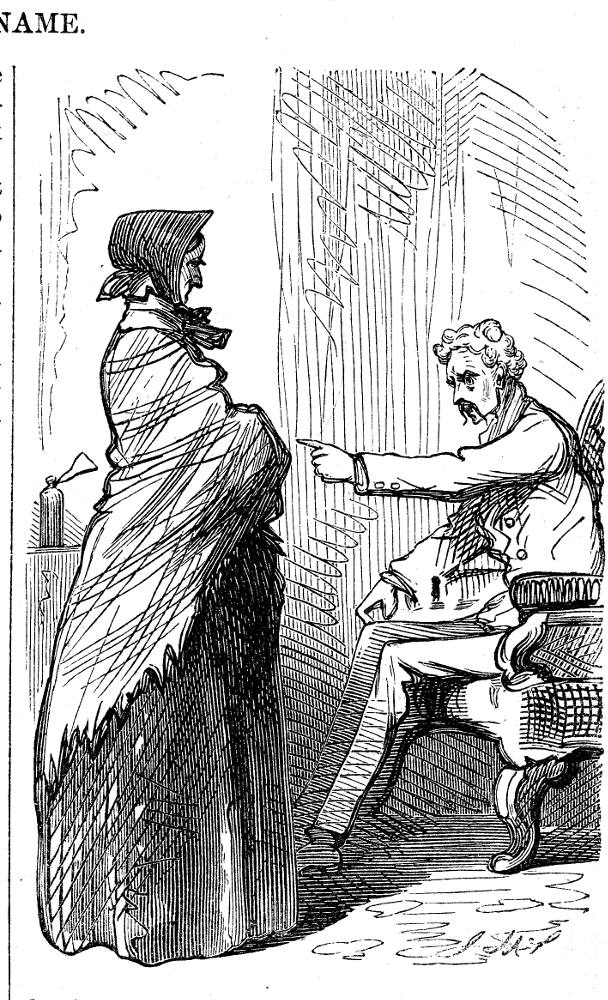 Mrs. Lecount moved with impenetrable dignity from the table to the door. Wood-engraving 11.3 cm high by 11.5 cm wide, or 4 ½ inches square, framed, for instalment thirty-five in the American serialisation of Wilkie Collins’s No Name in Harper’s Weekly [Vol. VI. — No. 306] Number 35, “The Fifth Scene, Baliol Cottage, Dumfries.” Chapter II, (page 714; p. 217 in volume), plus an uncaptioned vignettte of Mrs. Lecount and Noel Vanstone (Chapter II: p. 714; p. 217 in volume): 9.6 cm high by 5.6 cm wide, or 4 inches high by 2 ¼ inches wide, vignetted. [Instalment No. 35 ends in the American serialisation on page 715, at the end of Chapter II. Precisely the same number containing Chapters I and II without any illustration ran on 8 November 1862 in All the Year Round.]