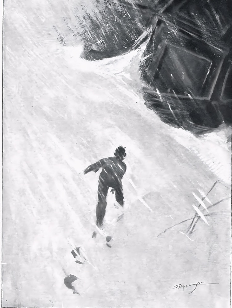 Equally important were interpretive approaches which privileged certain aspects of the theme of travel and technology. In ‘The First Men in the Moon’ Shepperson not only materializes the sphere but adds another layer of meaning in his emphasis on its robust physicality. In so doing he foregrounds the author’s notion of the vehicle as a place of safety: his focus on its iron plates highlights its apparent invulnerability – even when it is shown on fire during flight – and in another illustration he shows Bedford and Cavor peering out through a porthole in what appears to be a womb-like space, creating an absolute division between the familiar inside and the threatening outside. The functioning of the sphere as both an object and an idea is further stressed by the image of Bedford’s struggling to escape as he toils through the lunar snow; expressionistic in effect, the illustration contrasts the swirling whiteness with the reassuringly solid shape of the black craft.