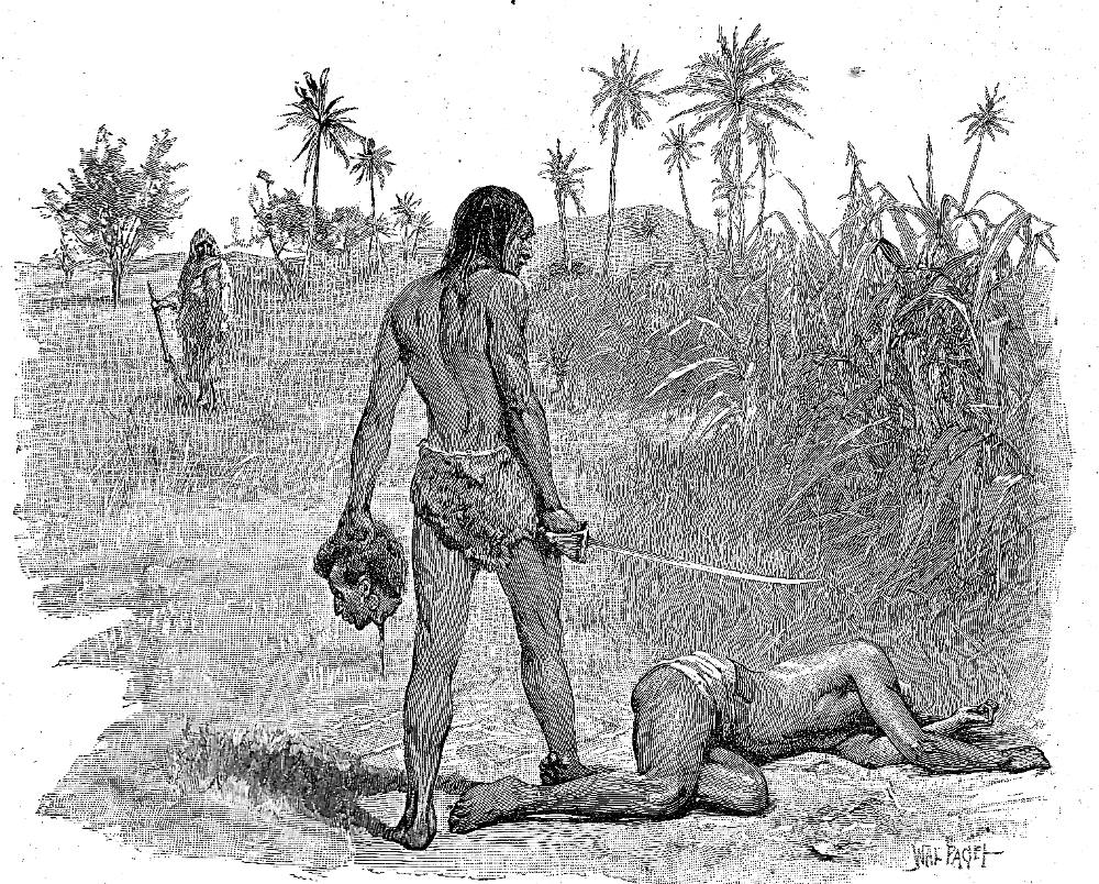 Having knocked this fellow down, the other who pursued him stopped, as if he had been frightened, and I advanced towards him: but as I came nearer, I perceived presently he had a bow and arrow, and was fitting it to shoot at me: so I was then obliged to shoot at him first, which I did, and killed him at the first shot. The poor savage who fled, but had stopped, though he saw both his enemies fallen and killed, as he thought, yet was so frightened with the fire and noise of my piece that he stood stock still, and neither came forward nor went backward, though he seemed rather inclined still to fly than to come on. I hallooed again to him, and made signs to come forward, which he easily understood, and came a little way; then stopped again, and then a little farther, and stopped again; and I could then perceive that he stood trembling, as if he had been taken prisoner, and had just been to be killed, as his two enemies were. I beckoned to him again to come to me, and gave him all the signs of encouragement that I could think of; and he came nearer and nearer, kneeling down every ten or twelve steps, in token of acknowledgment for saving his life. I smiled at him, and looked pleasantly, and beckoned to him to come still nearer; at length he came close to me; and then he kneeled down again, kissed the ground, and laid his head upon the ground, and taking me by the foot, set my foot upon his head; this, it seems, was in token of swearing to be my slave for ever. I took him up and made much of him, and encouraged him all I could. But there was more work to do yet; for I perceived the savage whom I had knocked down was not killed, but stunned with the blow, and began to come to himself: so I pointed to him, and showed him the savage, that he was not dead; upon this he spoke some words to me, and though I could not understand them, yet I thought they were pleasant to hear; for they were the first sound of a man’s voice that I had heard, my own excepted, for above twenty-five years. But there was no time for such reflections now; the savage who was knocked down recovered himself so far as to sit up upon the ground, and I perceived that my savage began to be afraid; but when I saw that, I presented my other piece at the man, as if I would shoot him: upon this my savage, for so I call him now, made a motion to me to lend him my sword, which hung naked in a belt by my side, which I did. He no sooner had it, but he runs to his enemy, and at one blow cut off his head so cleverly, no executioner in Germany could have done it sooner or better; which I thought very strange for one who, I had reason to believe, never saw a sword in his life before, except their own wooden swords: however, it seems, as I learned afterwards, they make their wooden swords so sharp, so heavy, and the wood is so hard, that they will even cut off heads with them, ay, and arms, and that at one blow, too. [Chapter XIV, "A Dream Realised," page 146]