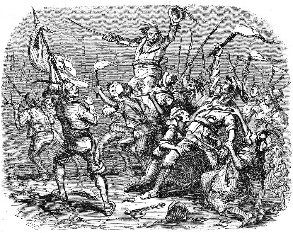 Phiz, perhaps eliciting fears of a French Revolution revived on English soil, has the mechanics led by a member of the bourgeoisie, possibly a retired officer, who points with his sabre towards the smoking factory-chimneys on the distant horizon. A woman desperately tries to prevent her enthusiastic husband (right) from joining the agitators, as the torch-light procession is likely to lead to violence, and will be put down with force. Although this mob of "unemployed labourers" carries torches, few of them possess regular weapons; even the sturdy rebel in the revolutionary cap to the right has just a pistol and long-bladed dagger. Such unemployed workers armed largely with scythes and billhooks could not have expected to be successful against properly trained and well-armed cavalry.