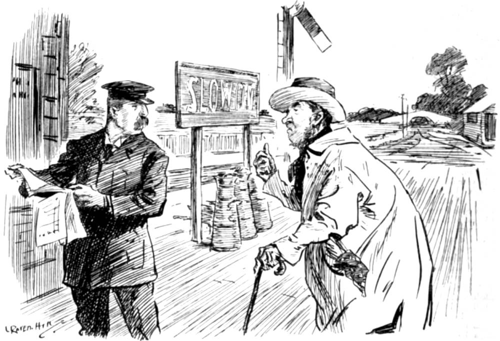 Somersetshire Rustic (on seeing the signal drop). “Ar don’t know if it’d make any diufference, Maister, but thic ther’ bit ’o board of yourn ’ave a fallen down!”