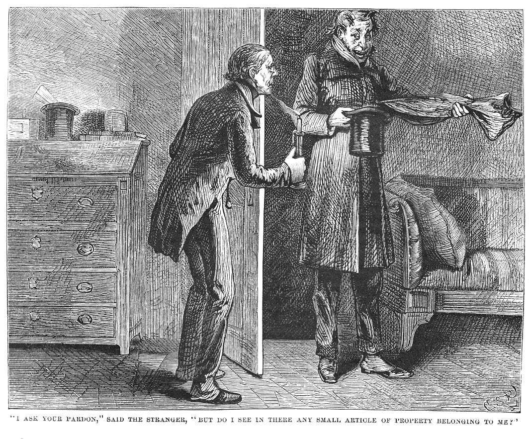 "'I ask your pardon,' said the stranger,'But do I see in there any small article of property belonging to me?'" — wood engraving from "Chambers," chapter 14 in The Uncommercial Traveller by Charles S. Reinhart (1844-1896). 10.3 cm high by 13.3 cm wide (full-page, horizontally mounted, 59). The wood-engraving illustrates a scene on the following page (60). [Click on image to enlarge it.]