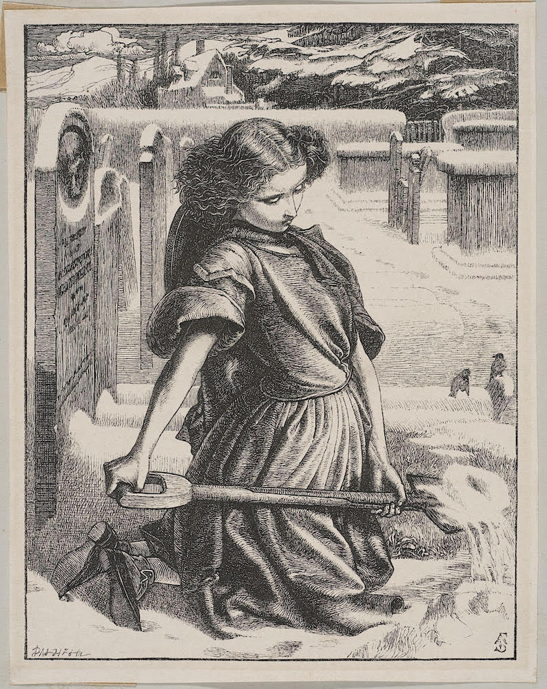 The drawing was commissioned to illustrate Dean Henry Alford's poem, "The Little Mourner," in English Sacred Poetry, compiled by the Rev. Robert Aris Willmott and first published by Routledge, Warne and Routledge, London, in 1862; it appears there on page 32. The poem tells of a young girl going to visit the graves of her parents and four sisters and explaining to a stranger why love compels her to clear their graves of snow. The wood engraving illustrates lines from the last stanza of the poem.